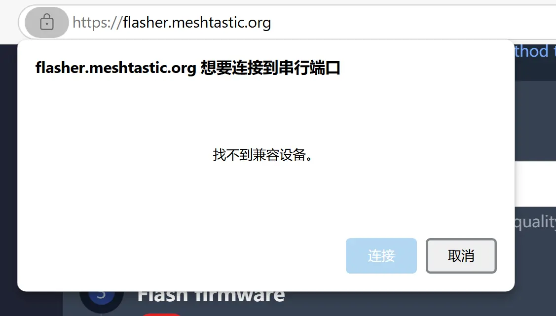 点击页面中的 Erase Flash and Install 按钮,Chrome 浏览器将弹出一个 Web Serial 窗口。在弹出的窗口中,选择您的设备对应的串口(一般情况下只有一个选项可以选择)。完成串口选择后,工具将自动开始擦除设备上的现有数据并安装新的 Meshtastic 固件。