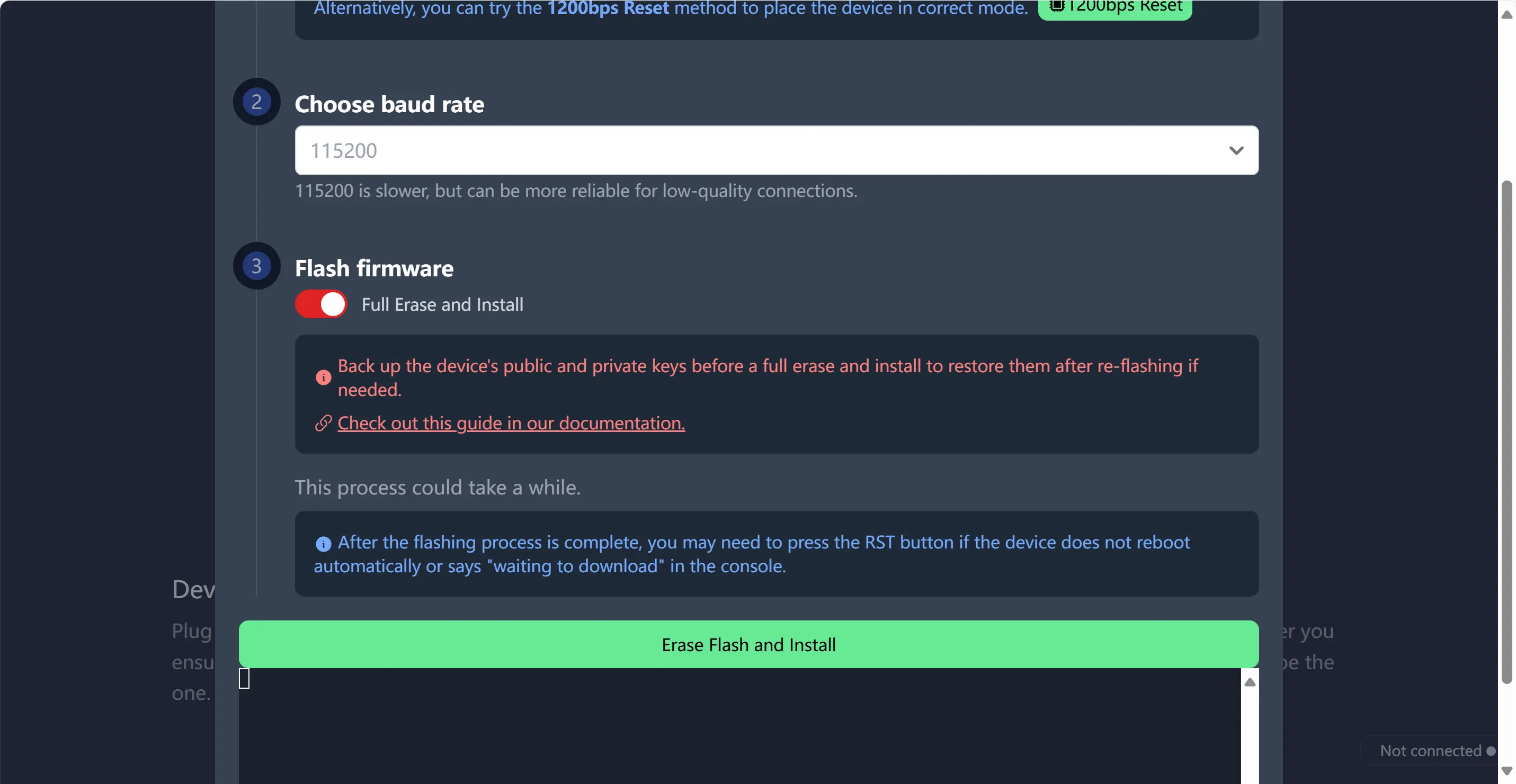 在页面的烧录选项中,找到 Full Erase and Install。点击该选项以启用完整擦除功能,此时按钮会变成红色,表示已经激活此功能。启用该选项后,固件烧录过程将完全覆盖设备的存储空间,确保新的固件正常运行。