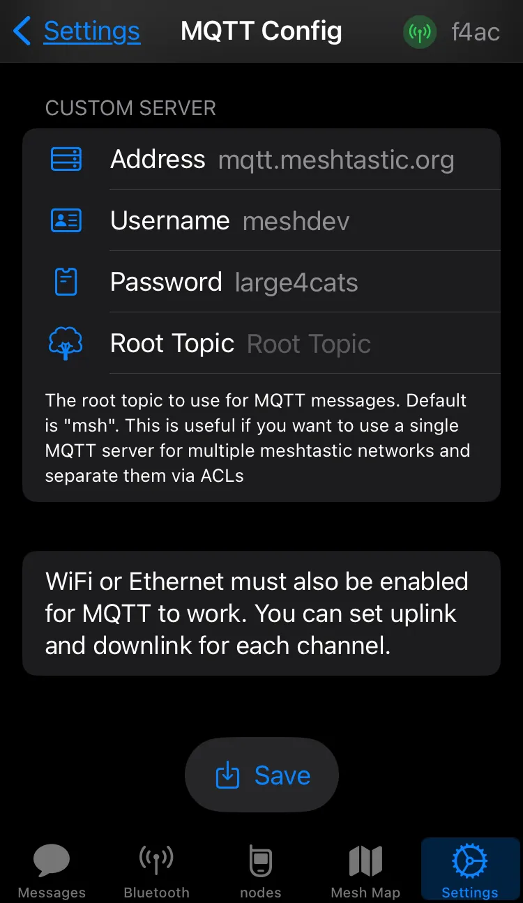 Server Address(服务器地址):如果使用 Meshtastic 官方的 MQTT 服务器,地址为
