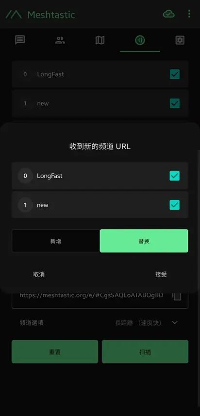 - 注意:扫码时一定要选择「覆盖」的方式,因为「追加」方式可能无法通信(频道号可能被混乱)。