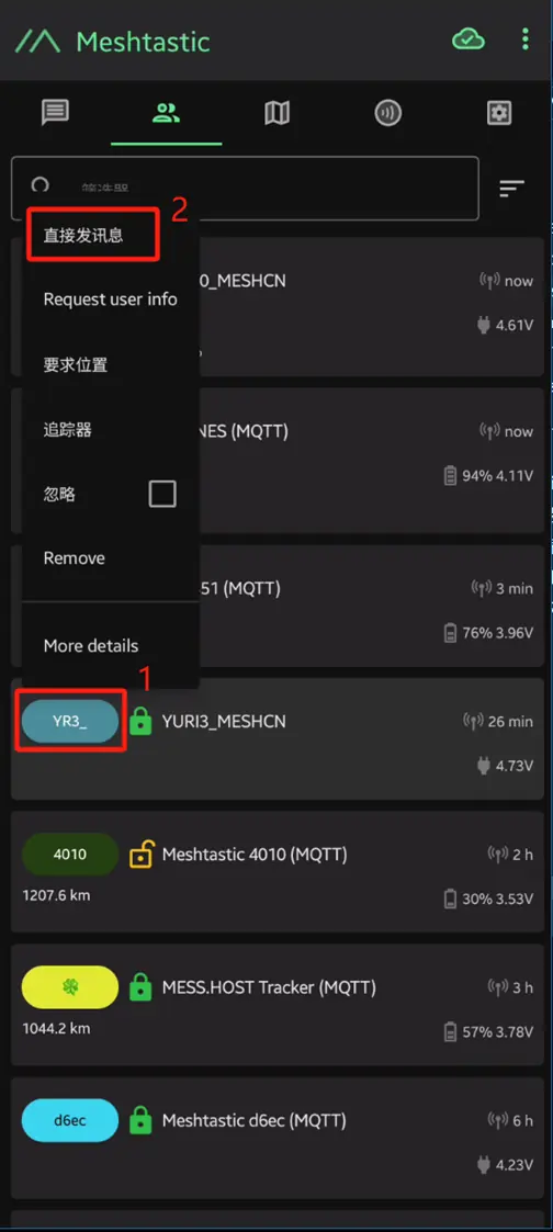 要进行点对点通讯(俗称私信),需要在 Node 列表 中看到对方的节点信息,点击对方的节点缩写,然后点击直接发信息。