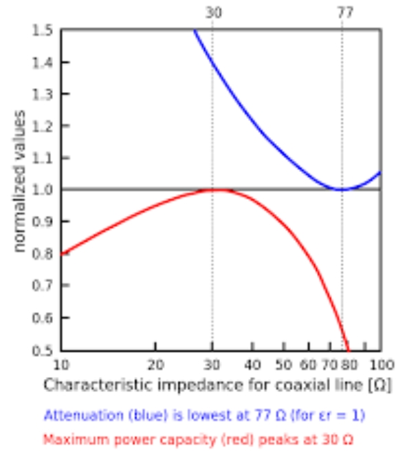 其实厂家们通常把阻抗设计到50欧姆,这算是行业的标准,如果不统一这会导致天线也不统一你需要有多个阻抗不同的天线。最主要的原因是50欧姆的同轴电缆性能处于中间位置(并不是工程师喜欢50欧姆)。损耗小的同轴电缆其特征阻抗分别是30欧姆和77欧姆。其中,30欧姆的同轴电缆可以传输的功率是最大的,77欧姆的同轴电缆传输信号的损耗是最小的。30欧姆和77欧姆的算术平均值为53.5欧,方便计算我们取50欧。