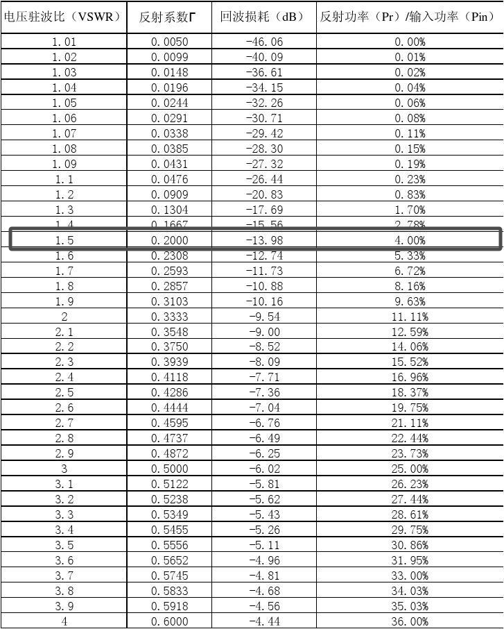 那么VSWR=1在实际情况为理想条件,大多数的情况为1.5左右,可以通过查表的方式判断我们的发射效率。例如VSWR=1.5时,我们的损耗功率为4%,也就是说发射端为100W,天线能辐射出去96W。